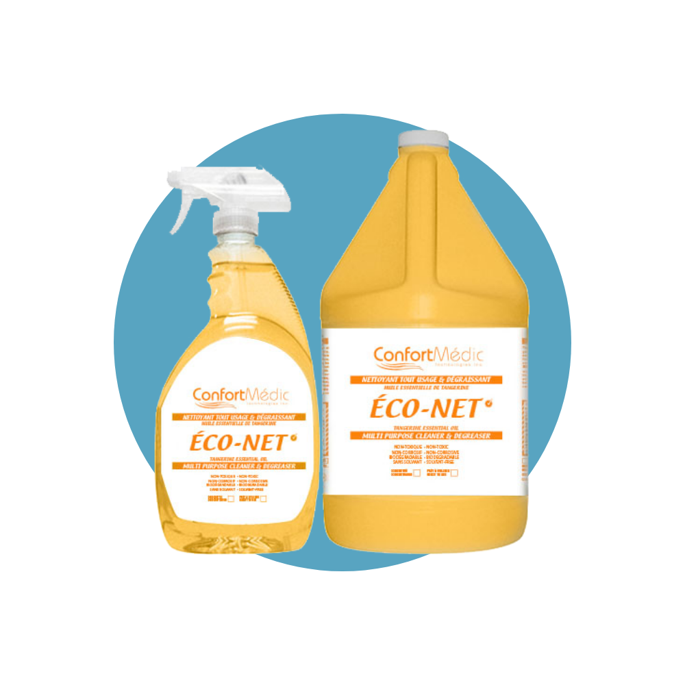 Eco-Net is a green cleaner and degreaser with tangerine essential oil. It can be used safely on all your equipment ConfortMedic.